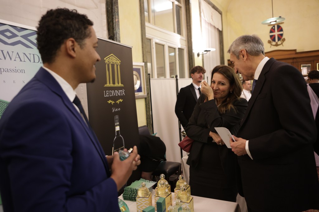 La serata ha trovato ulteriore arricchimento nella presentazione di progetti imprenditoriali concreti, tra cui la fragranza “Acqua Rwanda”, sviluppata utilizzando oli essenziali prodotti nel Paese. Un’iniziativa simbolica ma significativa, nata dall’idea di raccontare l’identità di una nazione anche attraverso l’esperienza sensoriale del profumo, coniugando creatività, branding territoriale e investimento produttivo.